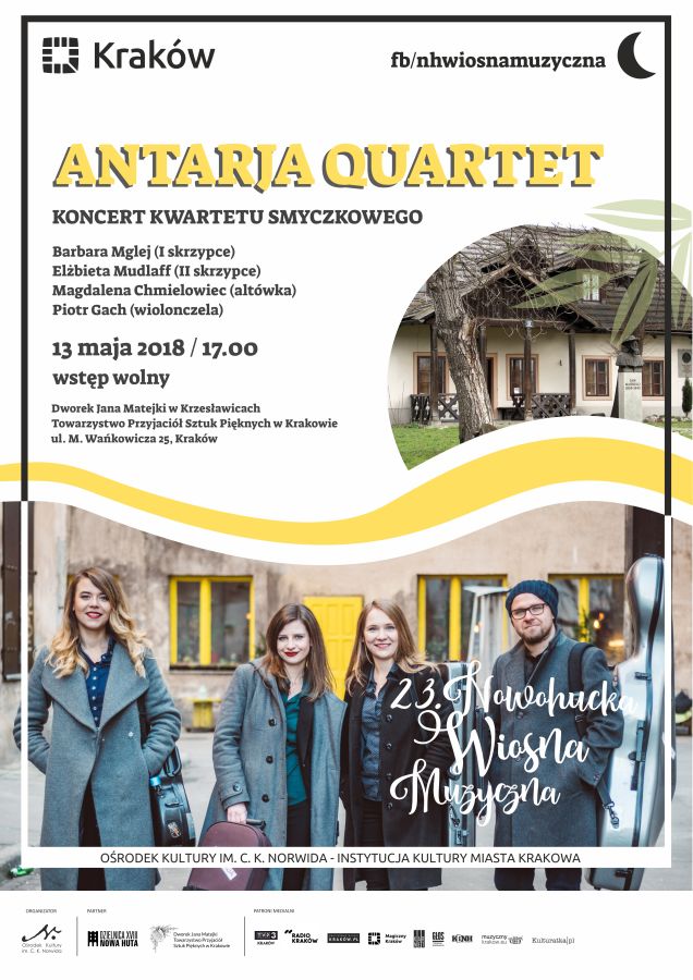 13 maja 2018 r. o godz. 17.00 w Dworku Jana Matejki w Krzesławicach, ul. M. Wańkowicza 25 wystąpi zespół Antarja Quartet w składzie: Barbara Mglej (I skrzypce), Elżbieta Mudlaff (II skrzypce), Magdalena Chmielowiec (altówka), Piotr Gach (wiolonczela). Koncert kwartetu smyczkowego odbędzie się w ramach 23. Nowohuckiej Wiosny Muzycznej.