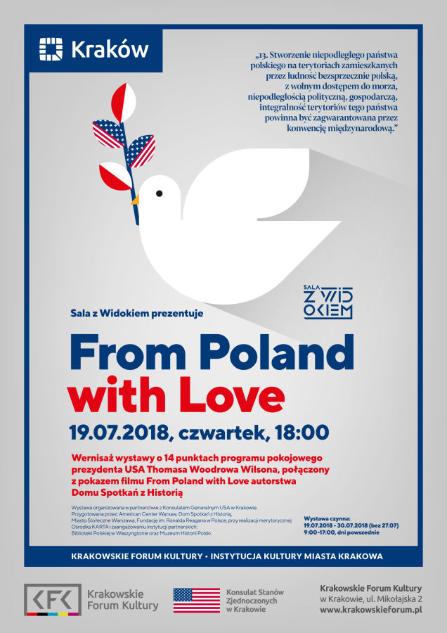 Krakowskie Forum Kultury oraz Konsulat Generalny USA w Krakowie serdecznie zapraszają dzisiaj, 19 lipca o godz. 18 na wernisaż wystawy "From Poland with Love” dotyczącej 14-punktowego planu pokojowego prezydenta USA Thomasa Woodrowa Wilsona, który przedstawił 8 stycznia 1918 roku w orędziu do Kongresu. 13 punkt dotyczył Polski i zakładał: „Stworzenie niepodległego państwa polskiego na terytoriach zamieszkanych przez ludność bezsprzecznie polską, z wolnym dostępem do morza, niepodległością polityczną, gospodarczą, integralność terytoriów tego państwa powinna być zagwarantowana przez konwencję międzynarodową.”