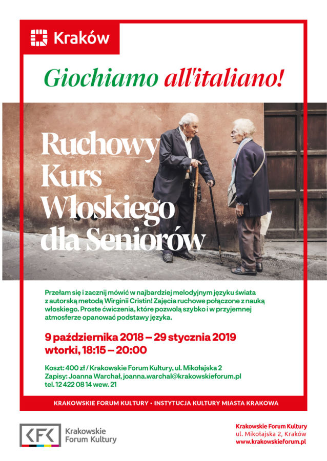 Przełam się i zacznij mówić w najbardziej melodyjnym języku świata z autorską metodą Wirginii Cristin! Zajęcia ruchowe połączone z nauką włoskiego. Proste ćwiczenia, które pozwolą szybko i w przyjemnej atmosferze opanować podstawy języka.