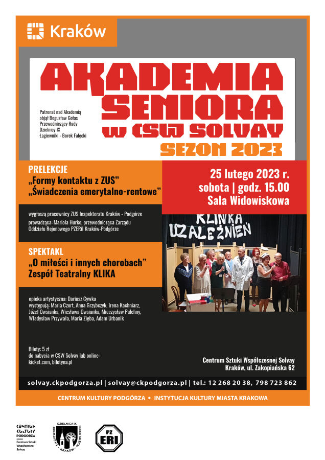 25 lutego 2023 r. zostanie zainaugurowany w Centrum Sztuki Współczesnej Solvay – filia Centrum Kultury Podgórza nowy sezon Akademii Seniora.