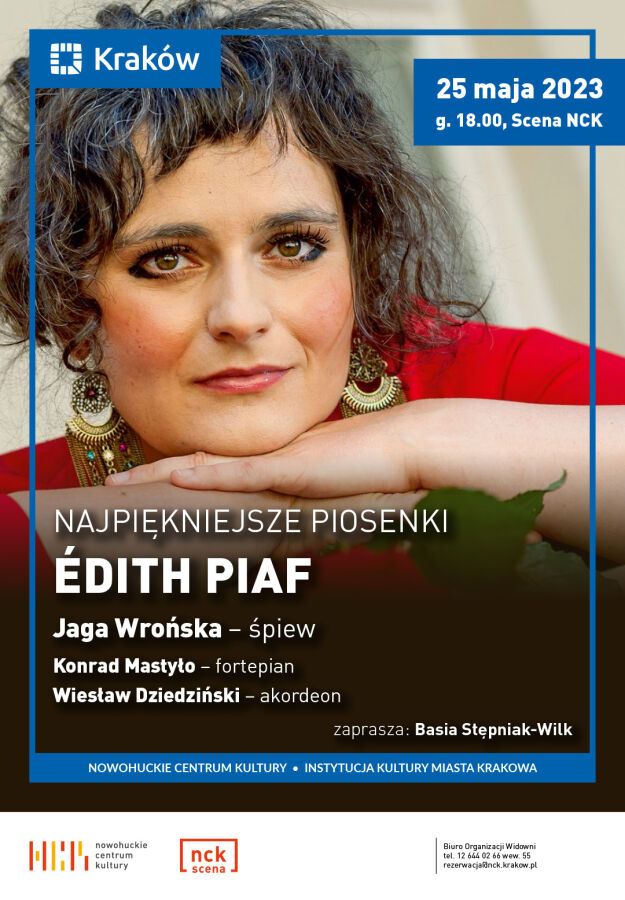 Nowohuckie Centrum Kultury zaprasza na koncert w wykonaniu Jagi Wrońskiej, wokalistki i autorki piosenek przez wiele lat związanej z Kabaretem Loch Camelot, znakomicie interpretującej utwory francuskiej pieśniarki Edith Piaf, która pełnymi emocji utworami z niebywałą ekspresją i dramaturgią przejmująco opowiada o miłości i samotności, a w ostatnich chwilach życia zapewnia – Non, je ne regrette rien!