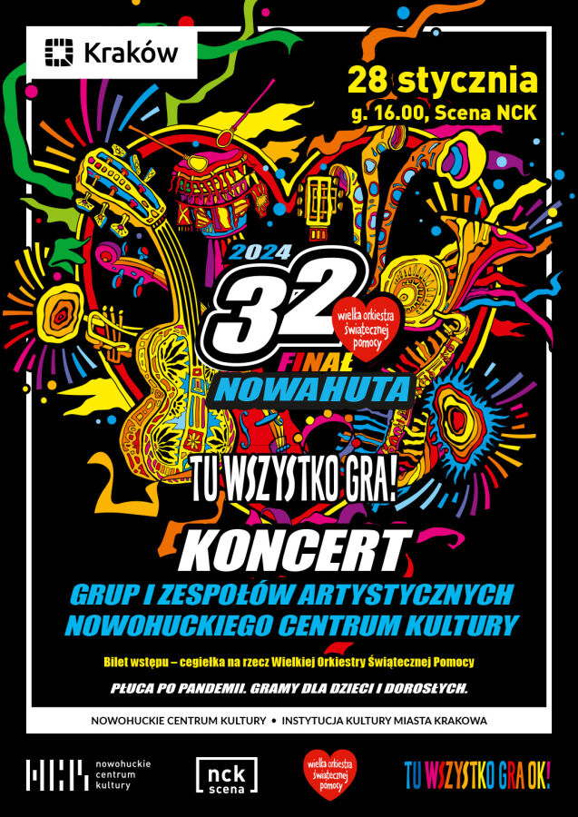 Koncert z udziałem grup i zespołów artystycznych NCK – wystąpią: Nowohucka Orkiestra Instrumentów Nieprzypadkowych, Muzyczny Klub Przedszkolaka, Teatrzyk Muzyczny KAMYCZEK, Akademia Tańca BAJLANDIA, Cheerleaders, soliści Studia Piosenki, Grupa Baletowa ETIUDA, grupy DISCO, grupy HIP-HOP, grupy Break Dance, Zespół Tańca Nowoczesnego KLIPS, Formacja Taneczna FLESZ DANCE, Grupa MARAM, Grupa Tańca Współczesnego FORMA, Amatorski Klub Tańca Towarzyskiego ENCEK i Formacja Młodzieżowa AKTT ENCEK