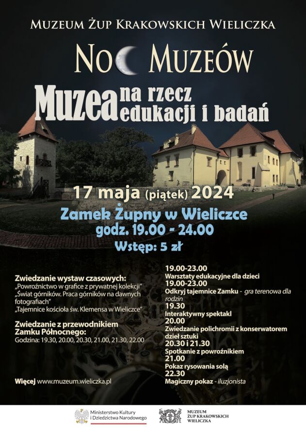Ponadto w programie będzie podziwianie solniczek, zwiedzanie wystawy czasowej „Powroźnictwo w grafice z kolekcji prywatnej” i spotkanie z powroźnikiem, warsztaty edukacyjne, rodzinna gra terenowa, interaktywny spektakl „Zaczarowany młynek”, pokaz artystyczny rysowania solą i pokaz magiczny. Zamek Północny będzie można zwiedzać z przewodnikiem o godzinie: 19.30, 20.00, 20.30, 21.00, 21.30 i 22.00.
