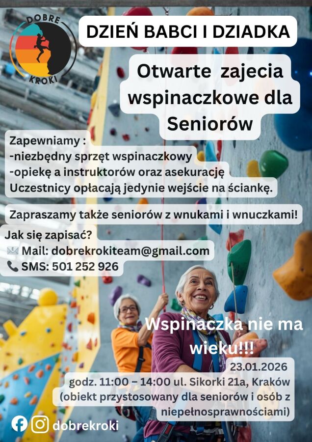 Z okazji zbliżającego się Dnia Babci i Dziadka Stowarzyszenie Dobre Kroki organizuje wyjątkowe wydarzenie wspinaczkowe dla seniorów na ściance wspinaczkowej.