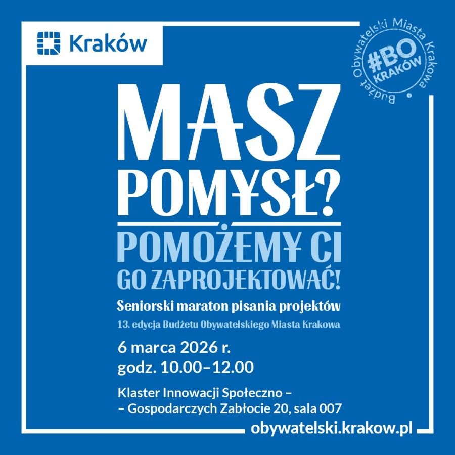 Zamień pomysł w projekt! Urząd Miasta Krakowa zaprasza mieszkanki i mieszkańców Krakowa do udziału w Maratonie Pisania Projektów w ramach 13. edycji Budżetu Obywatelski Miasta Krakowa. Spotkanie dedykowane jest seniorkom i seniorom.