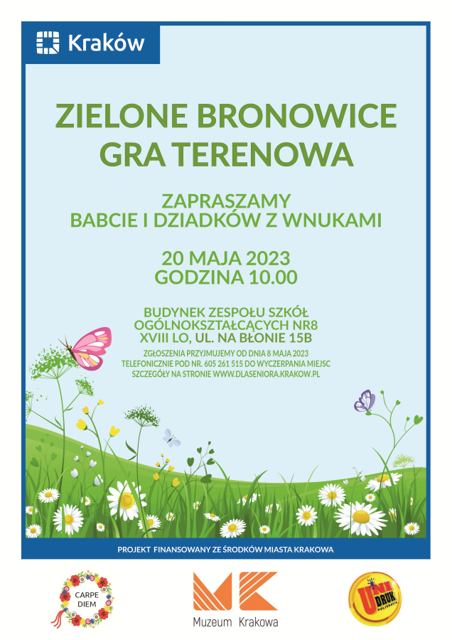 Stowarzyszenie „Carpe Diem” zaprasza Babunie i Dziadków z Dziećmi i Wnukami w dniu 20.05.2023 na GRĘ MIEJSKĄ „ZIELONE BRONOWICE”